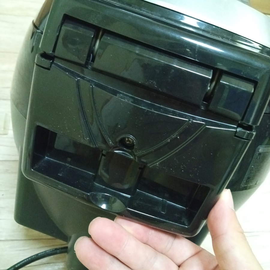 8. 밥솥 열고 닫는 손잡이 부분도 분리해야 해요. 손잡이 부분을 옆에서 보면 위에 부분과 아랫부분이 따로 연결되어 있는 것을 볼 수 있어요. 손잡이의 옆쪽을 한 번 보세요. ( 이 사진은 위에서만 찍은 사진입니다.) 납작한 드라이버로 그 간격을 끼워보거나 손으로 당기면 분리가 되고요. 저는 손으로 가만히 힘주면서 당겨서 뺐어요. 빼고 나면, 그 안에 나사로 고정이 되어 있는데, 그 나사도 빼주면, 손잡이도 완전히 분리가 되네요.