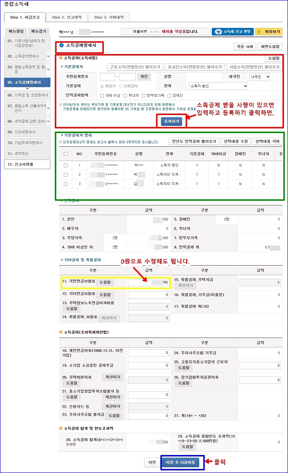 소득공제명세서 단계가 나오는데요. 저는 연세 많으신 부모님 인적공제항목에 해당되어서 소득공제 등록 했습니다. 자신에게 맞는 소득공제 되는 부분이 있으면 솔직하게 입력하고 소득공제 더 받으시면 됩니다. 특별한 거 없으면 그 외엔 그냥 다 넘어가면 됩니다.