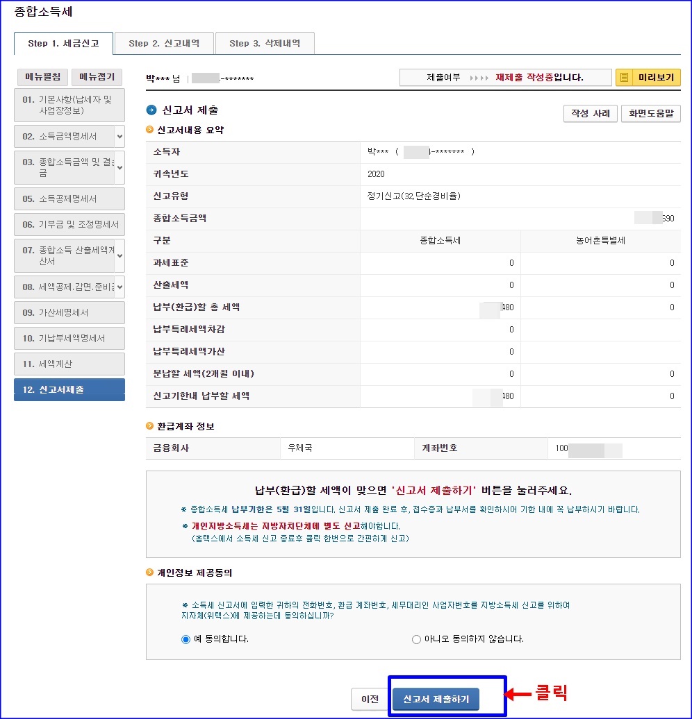 이제 단계를 다 넘어왔으니, 세액계산이 되어 나옵니다. 자동으로 입력되어 지고요. 종합소득세 마이너(-)로 나오면 환급 받을 수 있는 금액이고, 플러스(+)로 나오면 더 내야해요. ^^. 근데 뭐 돈 많이 버시는 분들 아닌 이상, 대부분 마이너스로 나올 겁니다. 환급 받으셔야죠.^^ 생각대로 나왔으면 동의체크하고, 신고서 작성 완료 누르면 됩니다. 환급 받으려면, 꼭 금융회사와 계좌번호 입력하세요.