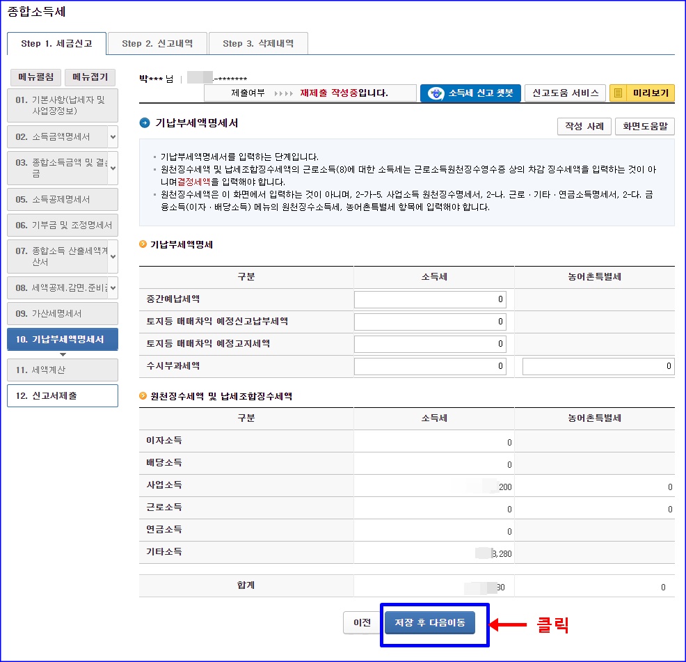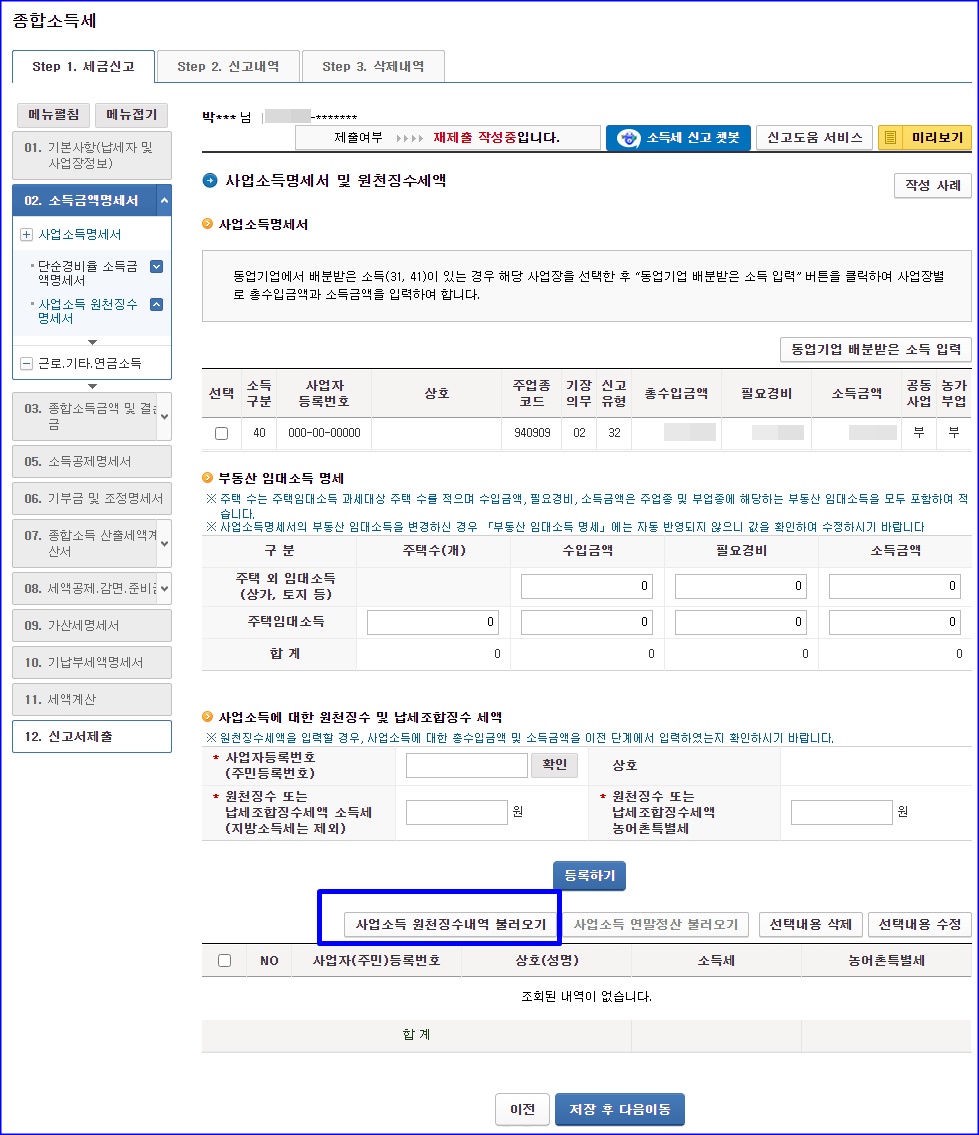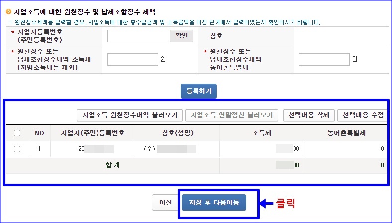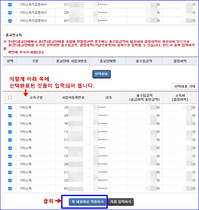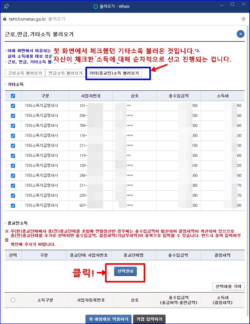 저는 기타소득도 꽤 있었습니다. 이것도 알아서 기타 소득 불러오기 누르면, 지금명세서 원천징수영수증 있는 것들 다 알아서 자동으로 뜹니다. 제세공과금 냈는데, 신고 안한 곳 있으면, 해당 업체에 전화해서 따지시고, 신고 안한 제세공과금 낸 것을 돌려받으세요. 선택해서 적용하고 저장 후 다음 단계로 이동하면 됩니다.