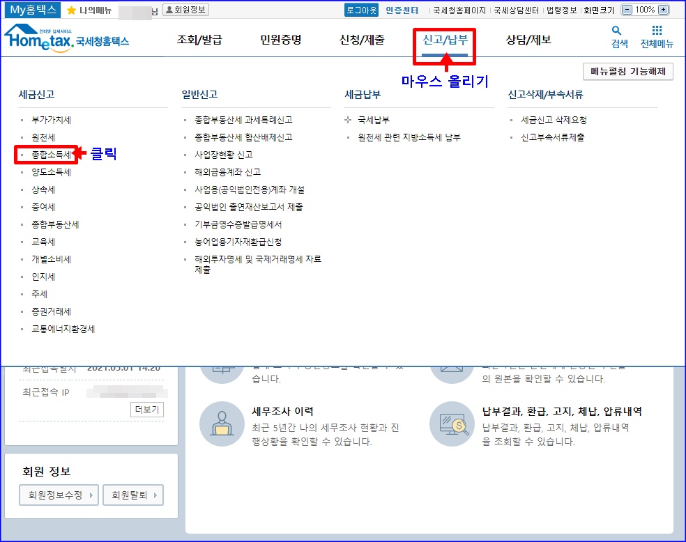 아래처럼 자신의 세금 정보를 메뉴 별로 클릭해서 다 볼 수 있게 해놨습니다.