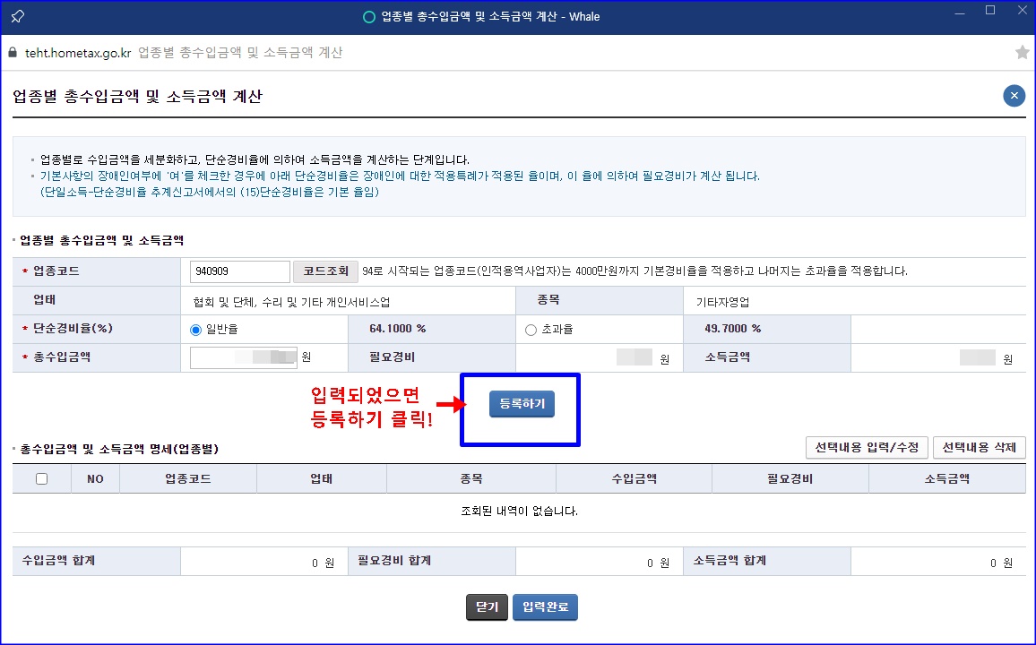 업종별 총수입금액 및 소득금액 계산 눌러서, 하라는 대로 진행하고, 수입 금액 입력하면 됩니다. 이미지 쭉 보세요. 신고 진행하면서 다 뜨는 화면이나 팝업창들이에요. 활성화 되어 있는 입력란 중에 입력해야 할 곳만 입력하면 됩니다. 한 번 해보고, 신고 기간에는 언제든 수정하고 다시 신고할 수 있으니까, 맘 편히 연습 삼아 해보시고, 이제 알겠다 싶으면 그 때 다시 한 번 확실하게 해주면 됩니다. 나중에 더 해야 하거나 할 게 있으면 다시 수정하거나 처음부터 다시 해주면 됩니다.