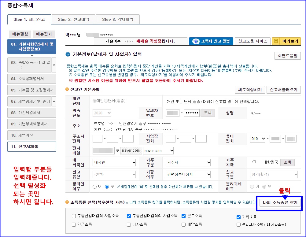 아래 세금신고 1번부터 11번까지 순서대로 그냥 입력하면 되고 쉽습니다. 자신의 소득 종류 선택하고, 모르면 나의 소득종류 찾기 눌러서 순서대로 하나씩 눌러서 세금신고 되어 있는 것 확인하고, 있는 것들 소득종류 선택해서 신고하면 됩니다. 저는 수입이 수입도 적고, 이자, 배당, 연금, 분리과세, 부동산임대업 이런 거 관련도 없어서 ^^, 일반 개인 분들은 근로소득 하나이거나, 더하면 기타소득, 부동산임대업외의 사업소득 정도 있을 것 같습니다. 부동산임대업외의 사업소득 같은 경우에는 링크프라이스 같은 제휴마케팅 하시는 분들 꽤 있으시죠. 이런 분들은 인적용역으로 여기에 해당 되는 것으로 알고 있습니다. 프리랜서 개인용역의 범위죠. 기타소득은 대부분 이벤트 경품 당첨되어 낸 제세공과금이 있으면, 기타소득에 많이들 등록되어 있을 겁니다.