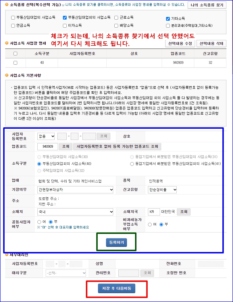 몰라서 여러 개 체크해도 없는 건 해당 안된다고 알아서 팝업 메시지 뜹니다. 저는 부동산임대업외의 사업소득으로 인적용역사업자 한 개 뜨더라고요.^^. 등록하고 다음으로 넘어가면 됩니다.