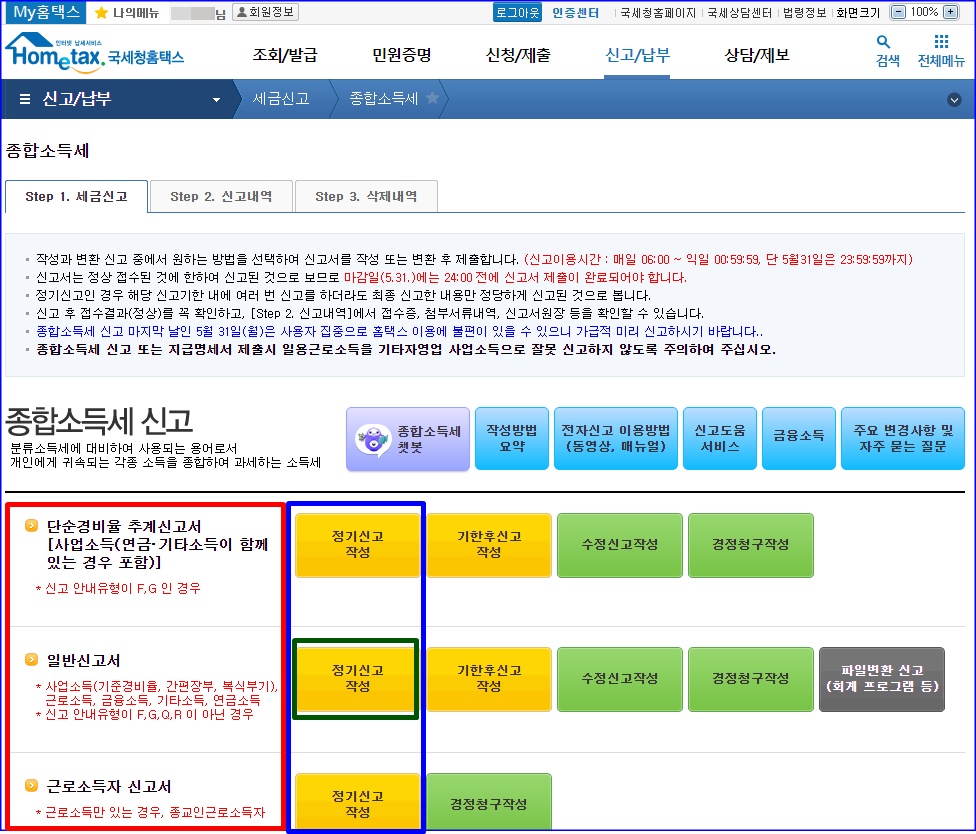 어떤 것을 눌러 신고해야 하는 지 다 알기 쉽게 적혀 있습니다. 단순경비율 추계신고서는, 사업소득(연금,기타소득이 함꼐 있는 경우도 포함). 이건 사업자들이 정기신고 작성 눌러 신고하시면 됩니다. 신고 안내유형이 F,G인 경우/ 일반신고서는 사업소득(기준경비율, 간편장부, 복식부기), 근로소득, 금융소득, 기타소득, 연금소득. 신고 안내유형이 F, G, Q, R이 아닌 경우. 개인 종합소득세 신고 하실 분들은 근로소득만 있는 경우가 아니라면, 이 일반신고서 눌러서 신고하시면 됩니다. 근로소득자 신고서는 근로소득만 있는 경우나 종교인근로소득자 분들이 정기신고작성 하시면 될 겁니다. 대부분의 개인들은 일반신고서 정기신고작성 눌러서 신고하면 될 겁니다.