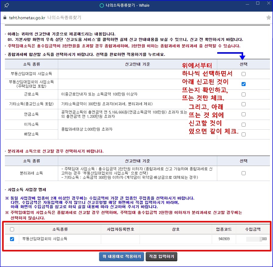어떤 소득이 있는 지 확실히 모르면, 나의 소득종류 찾기로 하나씩 체크해가면, 알아서 자동으로 소득 있는 건 뜹니다.