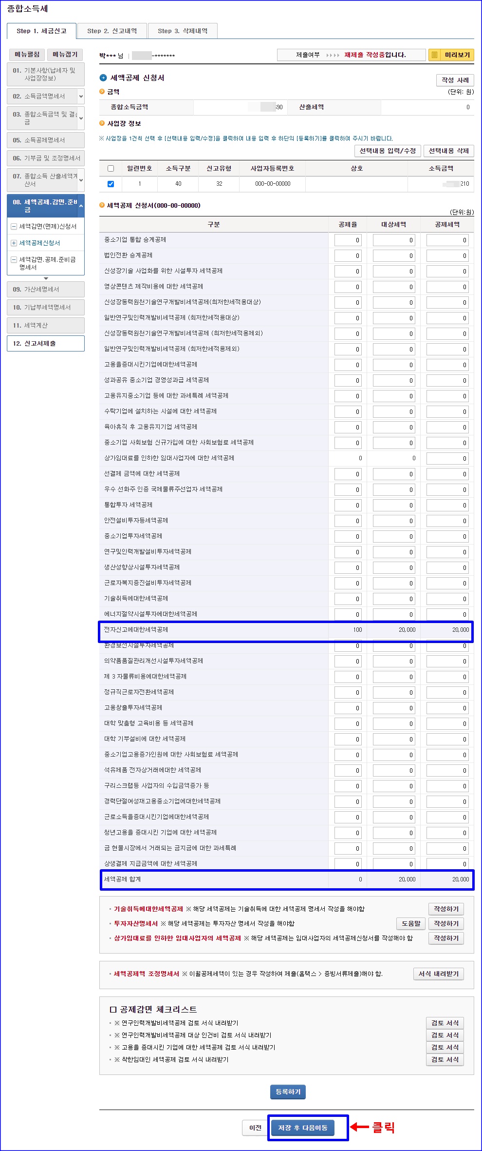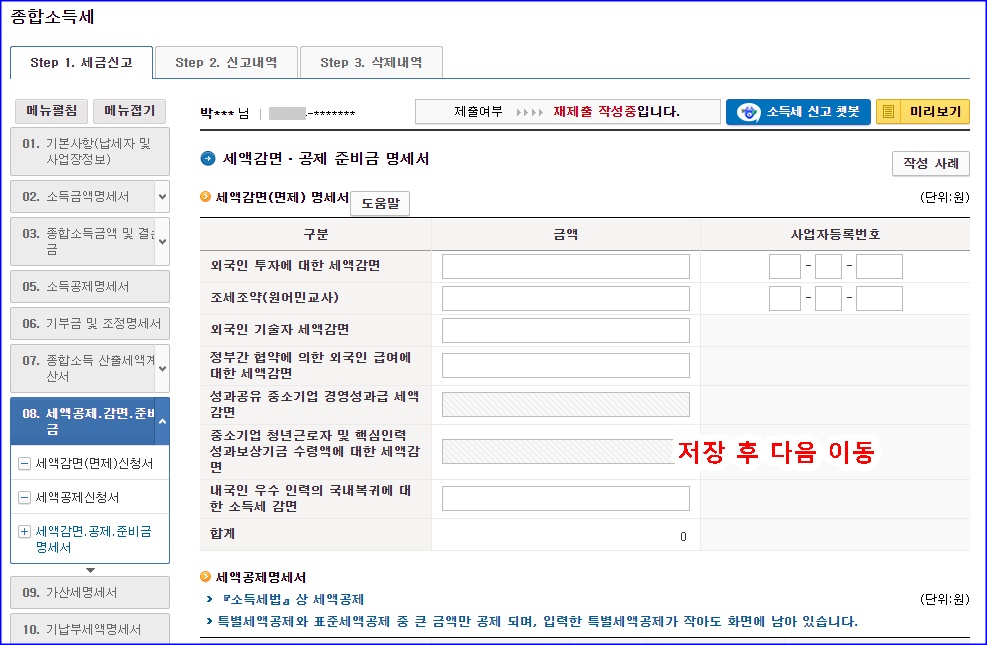 전자신고 했으니까, 세액공제 신청서 단계에서 2만원 입력됩니다. 전자신고에 대한 세액공제. 쭉쭉~ 저장 후 다음 이동하면 됩니다. 신고하는 거 별거 없어요. 쉬워요.