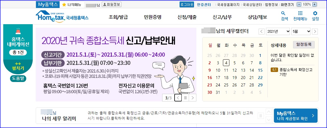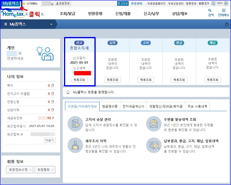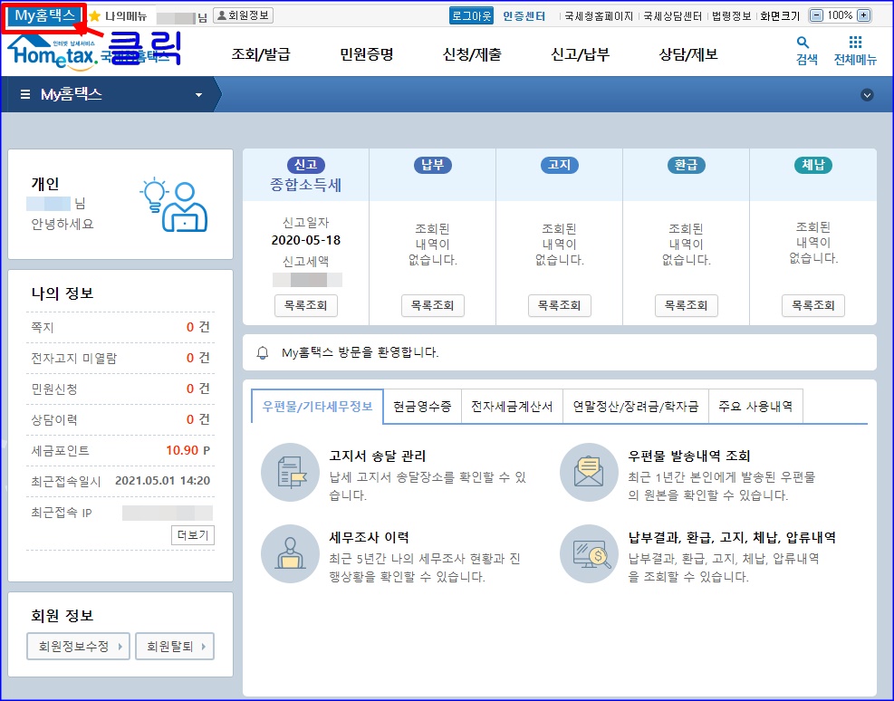 My홈택스 나의 세금정보 확인을 들어가면,