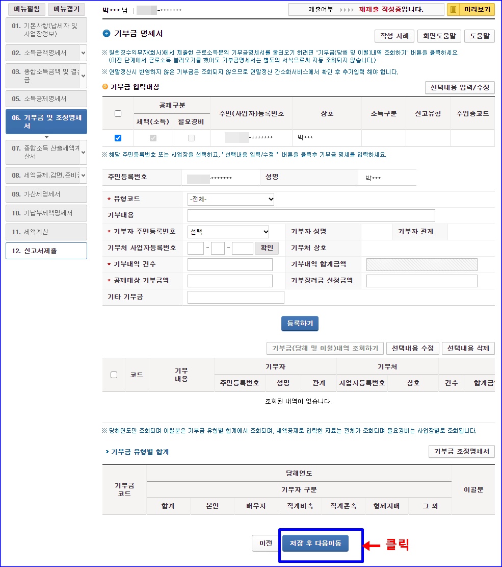 어려운 것 없고요. 그 다음부터 입력할 곳 입력하고 다음 화면으로 계속 넘어가면 됩니다. 입력해야 하는데 안되어 있으면 입력하라고 팝업 메시지 거의 뜹니다. 아래처럼 귀속년도는 자동으로 입력되어지고, 개인이면 주민등록번호 입력해서 조회하면 입력할 곳 대부분 입력되어 지고 입력 안된 곳 중에 입력해야 할 곳 몇 곳 입력하고 저장 후 다음 이동하면 됩니다.
