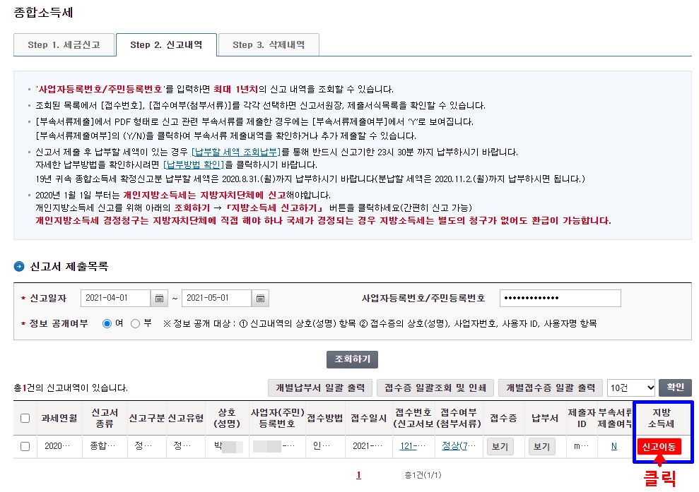 지방소득세는 따로 신고를 해야 하기에, step2신고내역 확인하면, 신고서 제출목록 나오는데, 끝에 지방소득세 신고이동 메뉴 버튼 있어요. 클릭해서 화면 나오는대로 입력해주면 됩니다. 소득세 신고를 토대로 지방세가 나오는거니까, 신고한 소득세에 맞추어 알아서 대부분 자동으로 입력되어 집니다.